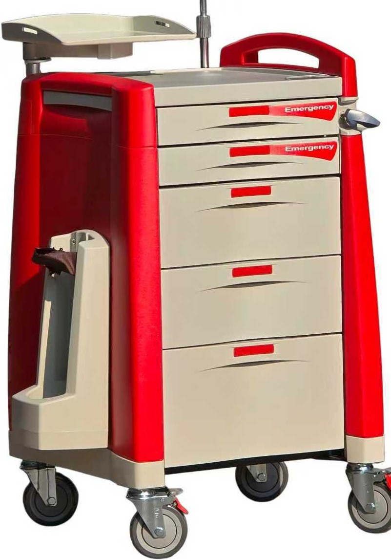 עגלת החייאה 5 ABS מגירות , נעילת פלומבה , צבע אדום כולל מדף לדפיברילטור , עמוד צעירוי , קרש גב